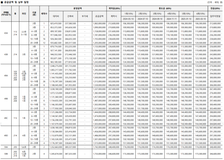 공급금액은 43타입 약 11억, 49타입 약 15억 59타입 약 17억정도 되네 ~~!