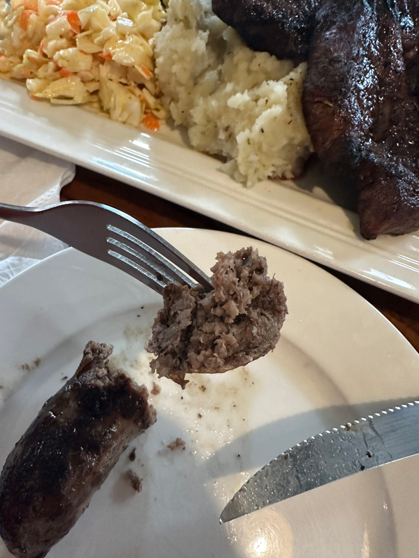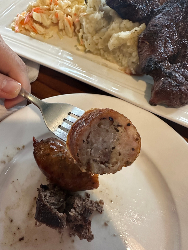미트 플래터는 양갈비 2대 + 수제소세지 2개 + 매쉬드 포테이토 + 콘슬로우 + 양배추샐러드로 구성되어있다. (원한다면 grilled shrimp를 추가하는 것도 가능하다)