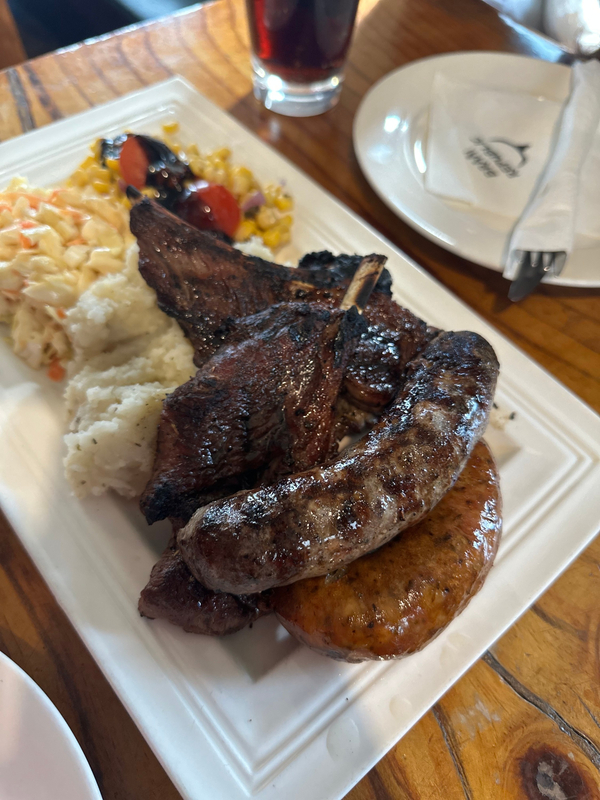 미트 플래터는 양갈비 2대 + 수제소세지 2개 + 매쉬드 포테이토 + 콘슬로우 + 양배추샐러드로 구성되어있다. (원한다면 grilled shrimp를 추가하는 것도 가능하다)