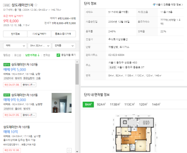 동쪽편 상도래미안1차 2004년식 아파트 59타입 기준 현재 최저가매물 9.5억