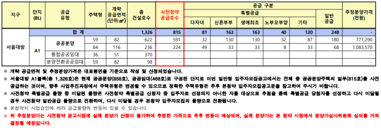 공급세대수는 총 1,326호 중 사전청약 공급호수 815호